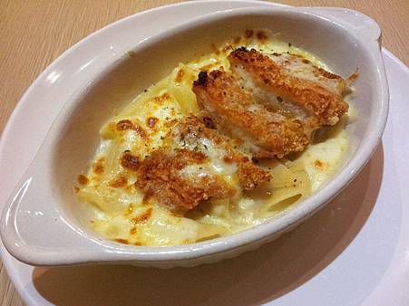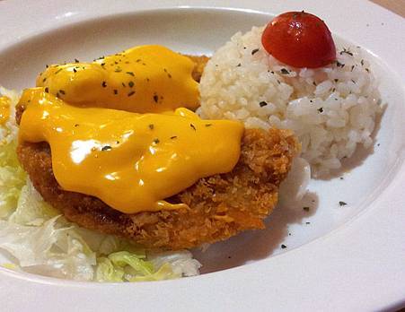 這道餐點是在炸好的藍帶豬排上淋上香濃的起司醬,