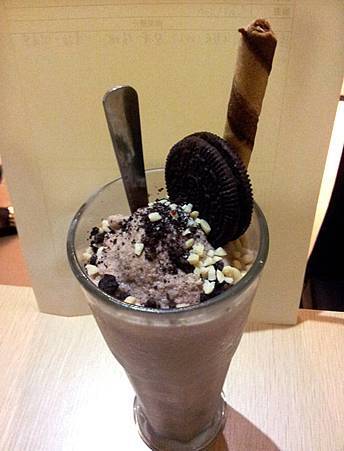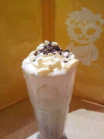 倒進巧克力歐蕾、牛奶、擠上鮮奶油後再灑上棉花糖跟巧克力碎片,
