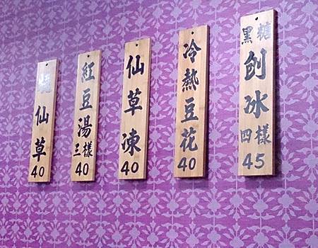 店裡壁紙有別於一般冰店的印象,採用紫色黑色的配色,並搭配上白色的桌面,木頭做的菜單,手寫的品名,有古今衝突的感覺呢!