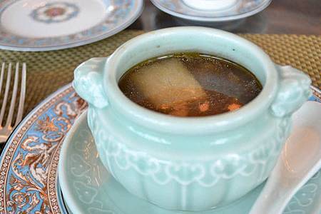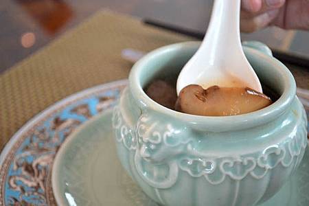 「古味傳香佛跳牆」遵循傳統台式做法熬製湯底,先將蔥蒜爆香,加入排骨酥、干貝、栗子、松茸、竹笙、芋頭、綠竹筍干,再以慢火熬燉7~8小時。芋頭煮得相當鬆軟但湯頭依然十分清澈,各種食材的精華都溶入湯汁,使湯頭自然鮮甜爽口。