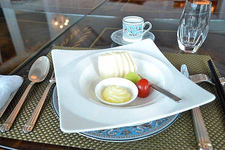 「關廟冷筍」選自台南關廟當季的冷筍,口感就像水梨一樣清甜脆嫩。炎炎夏日,正是竹筍盛產的季節,其中以八里、台中太麻里、關廟出產的筍子滋味特別鮮甜,每個地區出產的時間不一,主廚覺得以來自八里的竹筍品質最為出色。