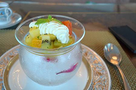 「馬斯卡朋起司鮮果」,運用新鮮的時令鮮果切丁,加入現榨果汁和法國甜酒,擠上滑順綿密的馬斯卡朋起司,最後再撒上跳跳糖粉。清香鮮甜的組合給人一種意想不到的驚喜,是一道清新爽口的精緻夏日甜品。