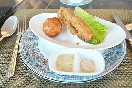 「蝦卷花枝炸雙拼」,酥炸鮮蝦卷為台灣經典名菜,曾獲選第四屆兩岸美食文化論壇「十大名菜點」。頂鮮蝦卷選用鮮活藍蝦,全程於冷氣房內新鮮現剝,酥脆軟綿的口感,讓許多賓客讚不絕口,成為餐廳的招牌必點長銷餐點!頂鮮花枝丸則是有別於其他坊間做法,裡頭吃得到新鮮的花枝顆粒,彈牙的口感也十分地受到大家的喜愛。搭配添加蘋果和芥末所調製的沾醬和蒜粉,融合台式與法式創造出一種獨特的風味。