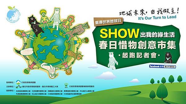 4/22地球日及6/5世界環境日是國際上重要的環境節日,為響應這兩個國際環境保護的重要節慶,臺北市環保局特與今年國際地球日主題為「地球未來,由我做主 (It’s Our Turn to Lead)」作連結,於地球日當日舉辦「SHOW出我的綠生活 春日惜物創意市集」公開招募民間團體一同參與愛物惜物二手市集活動,現場由局長、臺北市環保義工大隊幹部共同宣示在「食、衣、住、行、育、樂」各層面均要實踐環保行為;並同時宣布『SHOW出我的綠生活 春日惜物創意市集』正式起跑。