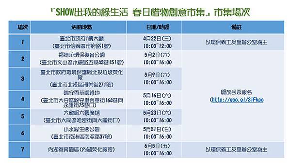 另在活動期間5/2~6/5將以每週1次以愛物惜物綠色市集的方式(如表),公開邀請民眾自由報名設攤(約15~20攤位)響應,本活動詳細資訊請逕至報名網頁(http://goo.gl/3iFkpo)查詢。