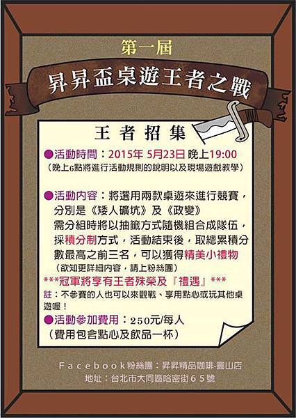 昇昇精品咖啡-圓山店這個月推出新活動❗──第一屆《昇昇盃桌遊王者之戰》!!!5/23(六) 晚上6點 開始遊戲說明,7點進行比賽快來享受美味咖啡及點心,一邊玩有趣的桌遊吧!冠軍還享有特殊優惠喔~