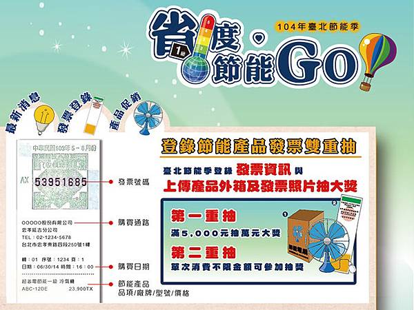 為讓民眾在炎炎夏日能享受清涼又能省荷包,6~7月推廣期間的合作特約門市亦特別推出各式超值優惠方案,例如買LED檯燈送LED 燈泡、買變頻省電冰箱現折2,500元、買省水節能標章洗衣機現折2,000元等多項優惠方案;另外,產業局又加碼推出「買節能產品 憑發票登錄抽大獎」活動,民眾只要至臺北市各特約門市購買節能產品,即可憑發票不限金額上網登錄,抽多項大獎。眾多豐富獎項等你來拿!好康資訊請上「臺北節能季」活動官網查詢。
