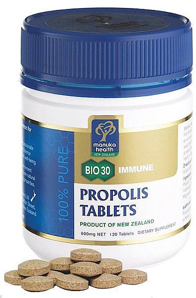 Manuka Health蜂膠取自於純淨的紐西蘭,由蜜蜂採集植物的汁液、花粉或花蜜後混合自己分泌的唾液與蜜臘。本產品使用紐西蘭BIO30™蜂膠且含高單位生物類黃酮,也被證實含量至少為30毫克/克(BIO30™)。蜂膠有豐富的胺基酸和微量元素也具有高含量的維他命,有38種寶貴的生物類黃酮、酚酸類和酯類,包括咖啡酸苯乙酯(CAPE)。紐西蘭BIO30™蜂膠錠屬溫和味道且容易咀嚼。