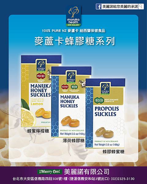 結合MGO麥蘆卡蜂蜜的香甜和紐西蘭蜂膠……口含一顆麥蘆卡蜂膠喉糖,能潤喉,恢復迷人嗓音,並保口氣清新,拉近人與人之間的距離,是兒童、成人皆愛的產品。