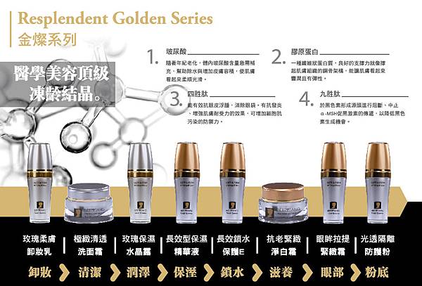 琺奇美妝世界提供多款系列保養品,添加高級元素,增加皮膚保濕與細緻其中Resplendent golden series 金燦系列更是加入了玻尿酸、膠原蛋白、四胜肽、九胜肽的頂級系列