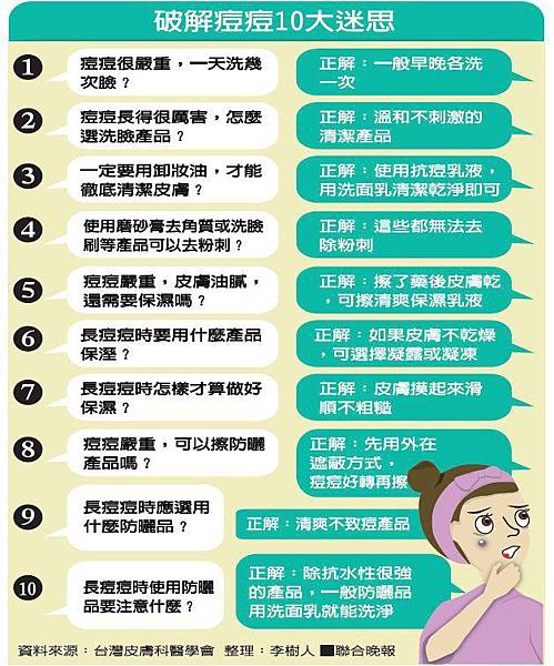 今天是世界皮膚健康日,台灣皮膚科醫學會公布民眾對痘痘的十大迷思,希望透過深入淺出的內容,讓每個青少年都能擁有健康肌膚。