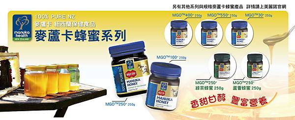 ◆麥蘆卡蜂蜜僅產在無污染的紐西蘭,是蜜蜂從麥蘆卡樹(Leptospermum Scoparium)所採收。麥蘆卡是一種小型茶樹,叢生於山坡地,在炎熱的夏天,盛開的花朵引得成群的蜜蜂來採集蜜,釀造出麥蘆卡蜂蜜,是為紐西蘭國寶級蜂蜜,質滑芳甘,濃醇蜜香,馥郁芬芳耐人尋味,且具有其他蜂蜜所缺乏的活性成份---MGO,是蜜中極品,吸引全球賞蜜人士與保健養生族群的青睞。