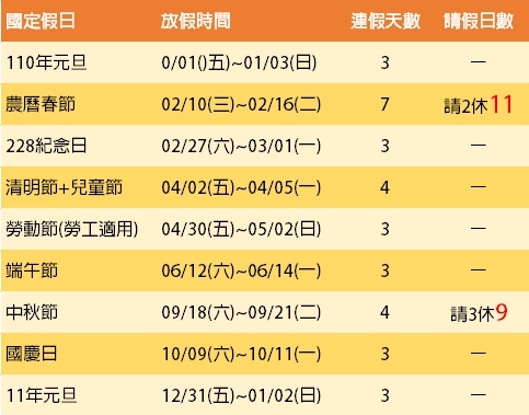 | 110 過年春節 | 7 天 | 2/10(三)-2/16(二) | 請2天假(2/8-9),連休11天 2/10調整放假,2/20(六)需補班 |